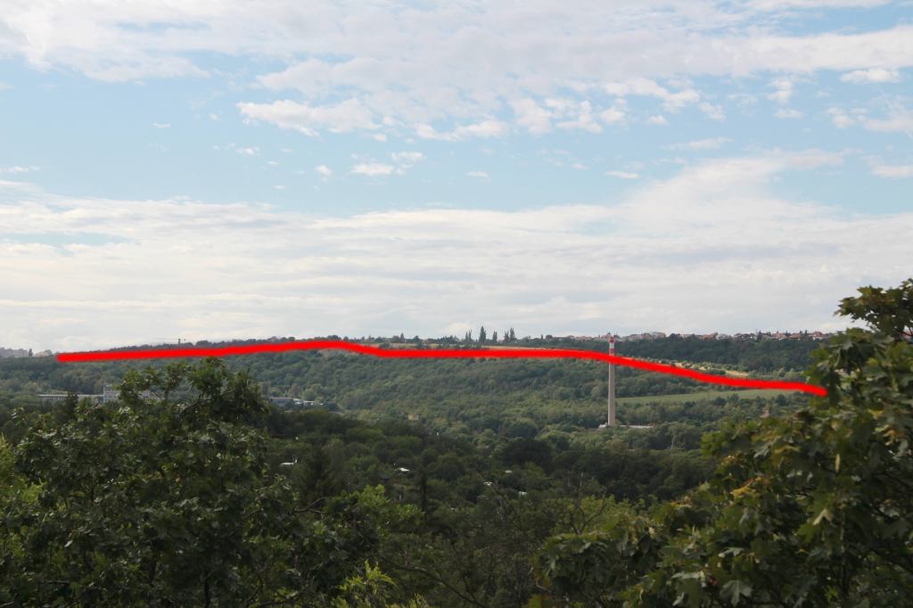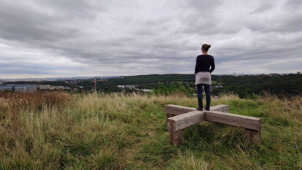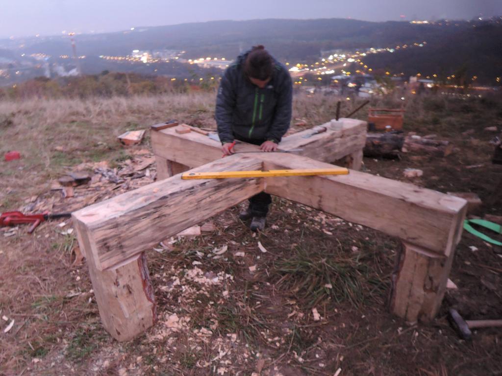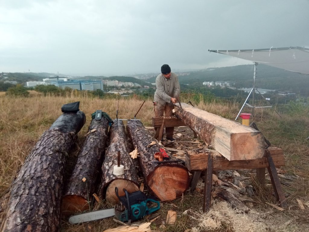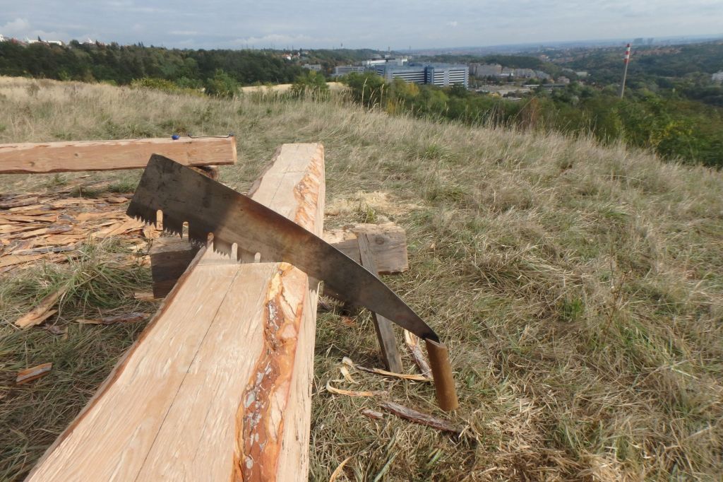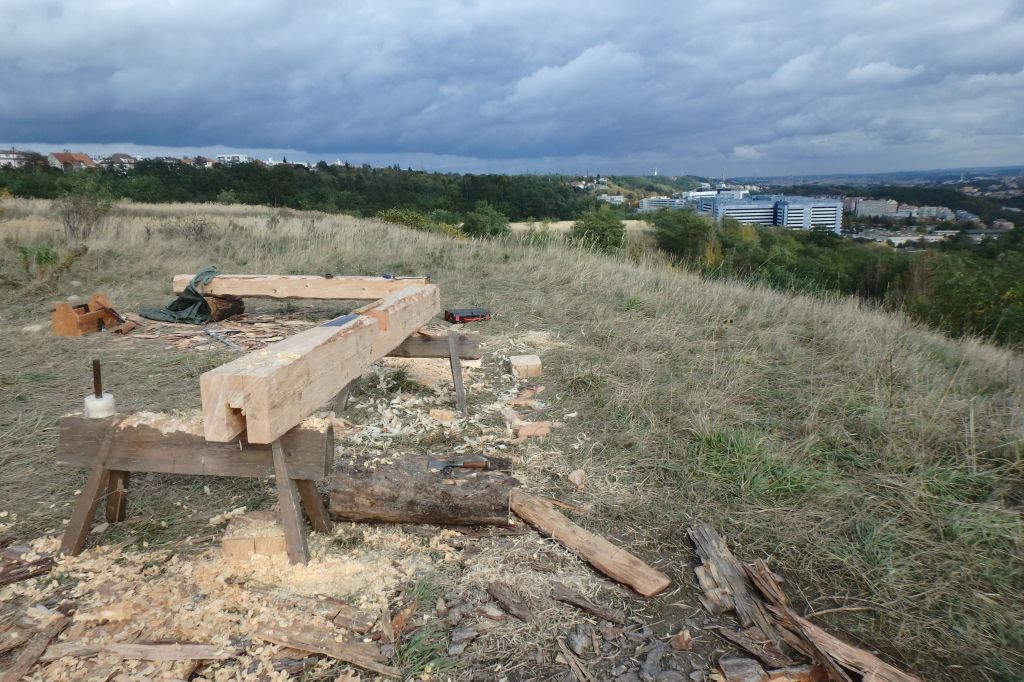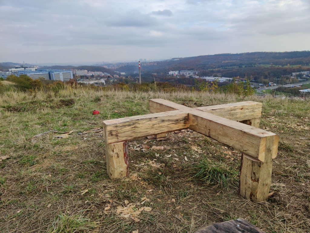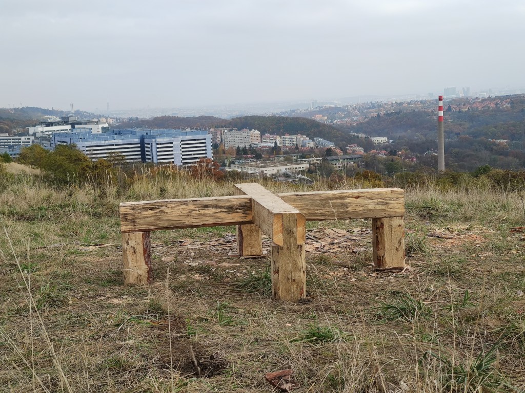 Produkce realizace dřevěného podstavce na temeni motolské skládky v průsečíku os vzdálených průhledů krajinou.