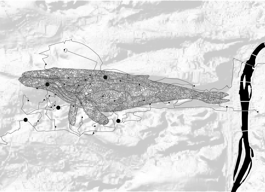 Postupně se během zkoumání místa a naslouchání okolí z navršeného kopce odloupla vrchní vrstva a odhalila autorce jeho vnitřní duši, obyvatelku – velrybu. Ta se svým zpěvem snaží přilákat lidi, kteří umí ve zvuku města slyšet její píseň.