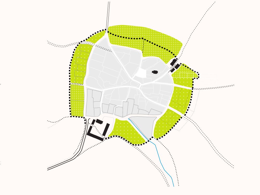 Při takovémto způsobu rozvoje zástavby dochází v první fázi k hledání skrytého potenciálu vlastního rozvoje celé oblasti a s tím spojeného primárního definování hranic jednotlivých částí. Nové hranice nejsou jen čarou v katastru, ale veřejným prostorem – cestou – rozhraním – linii, alternativou návsi – centra – bodu. Rozhraní je tak i prostředí umožňující snazší zakotvení a podporující vztah k „novému domovu“ jako k celku.