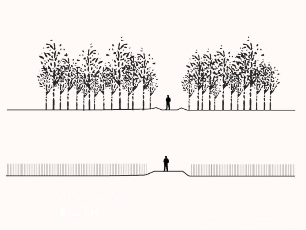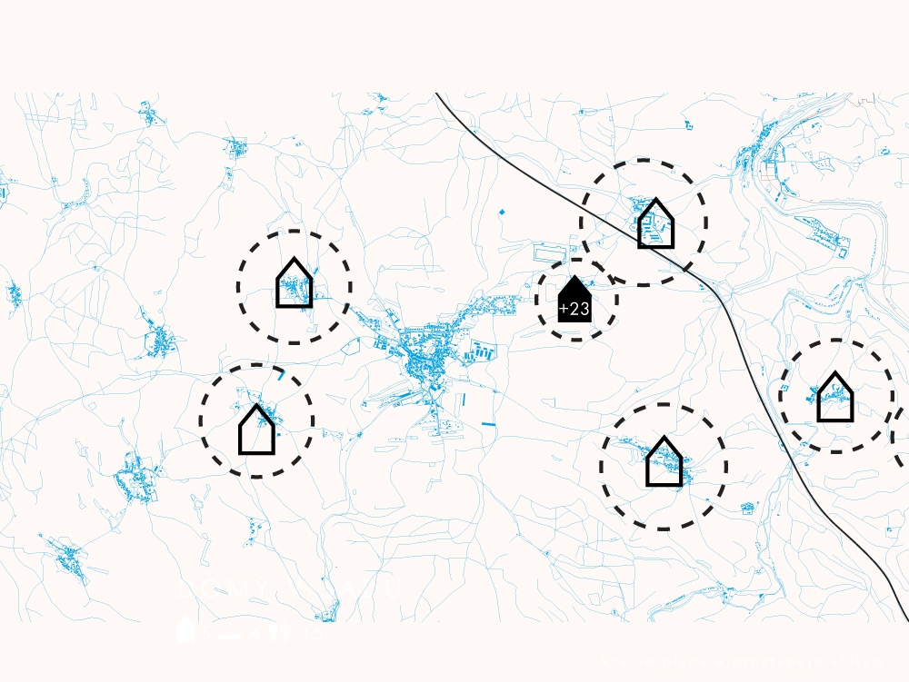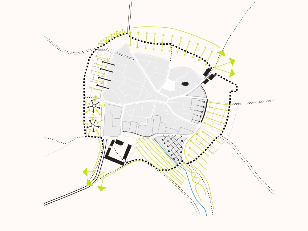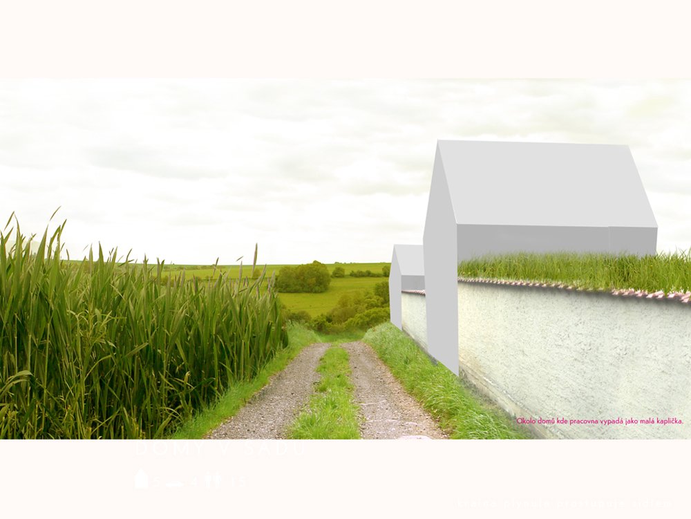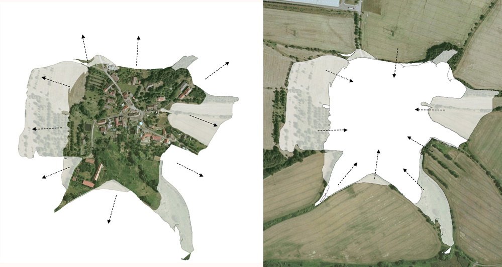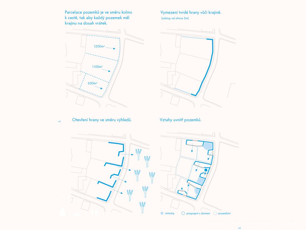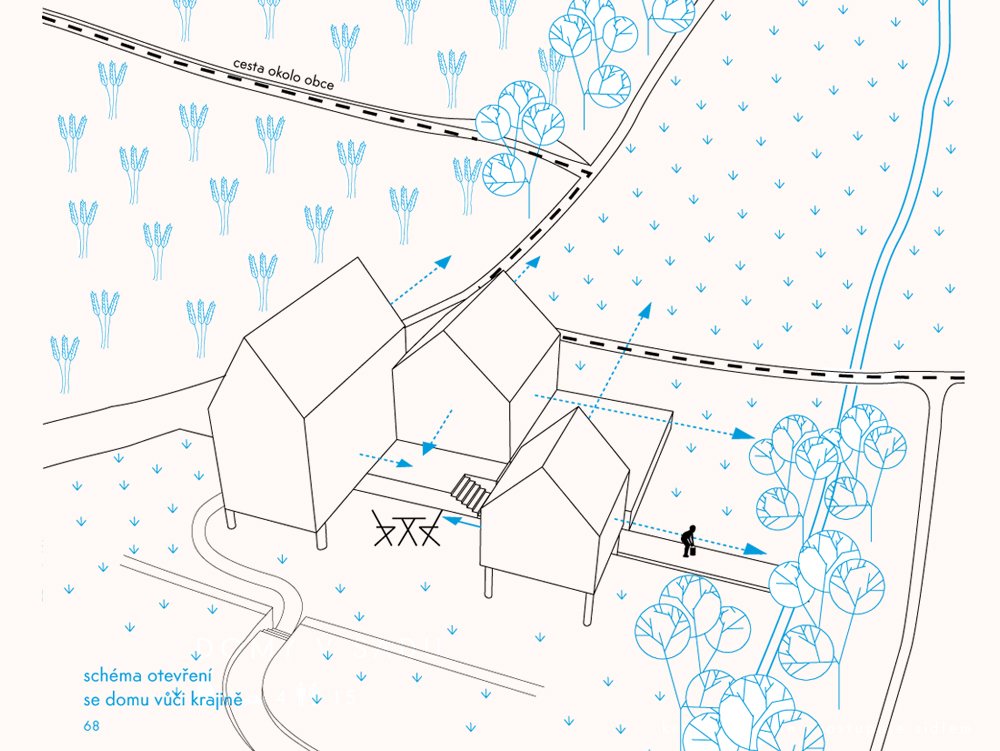 Skrze jednotlivé charaktery domů představuji místa plynulých přechodů a ostrých hran rozmezí krajiny a sídla, které jsou vnímány ze dvou pohledů (zevnitř ven a zpátky zvenčí dovnitř sídla). Jednotlivé domy jsou významné pro vnímání obce jako celku. Vzniká koncepce domu, který vítá (vztahujícího se k výhledům do okolí), tvrdá hranice domů u pole, prolínání krajiny u kolonie domů u potoka a solitérních domů v sadu, nejasná hrana krajiny v domech u louky. Spolu s nových hájem a zachovanými pastvinami vytváří toto rozhraní přechodovou zónu mezi intravilánem obce a krajinou při podpoření původních dominant obce (kostel, sýpka na kopci, starý statek).