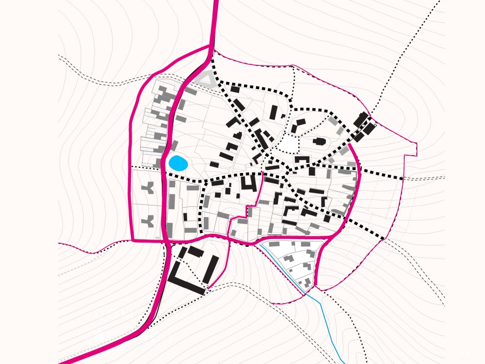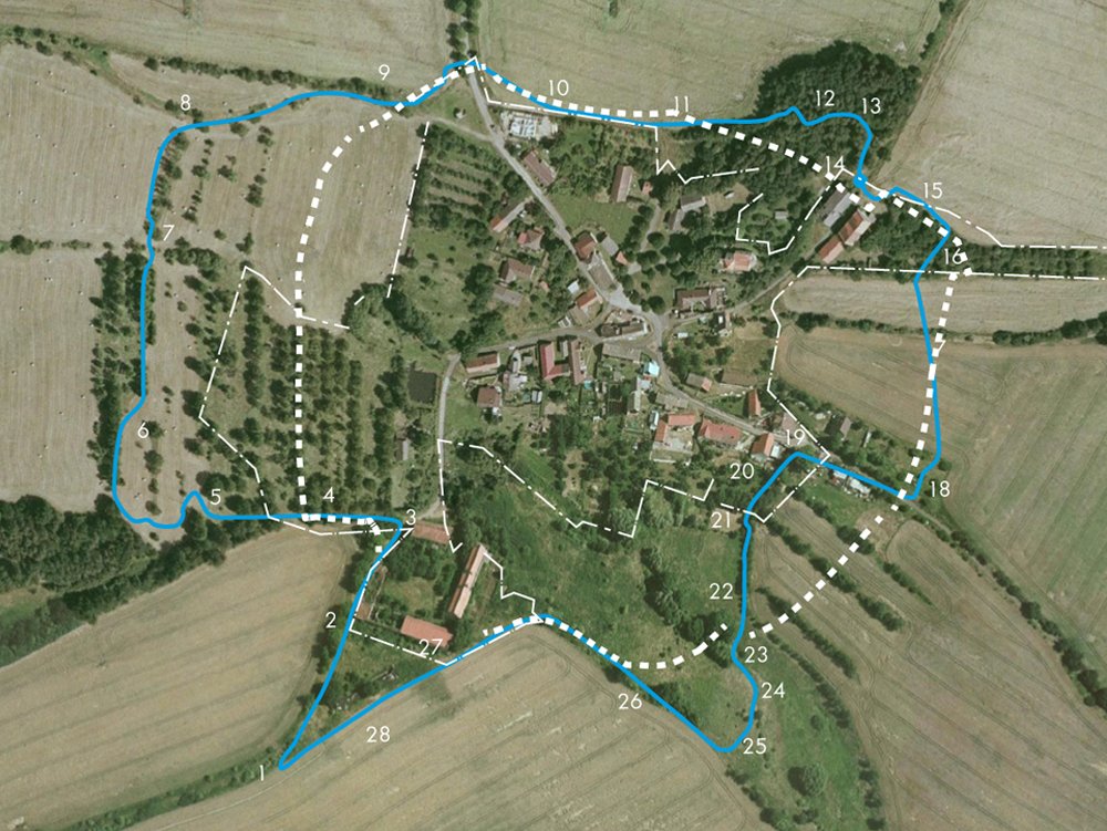 V obnově vsi s krajinnými prvky dále pracuji jako se svébytnými fenomény. Navracím jim jejich význam, vytvářím kontext pro jejich působení. Důležitá místa sdružuji do sedmi celků – oblastí, které ovlivňují charaktery domů a jejich prolínání s krajinou.